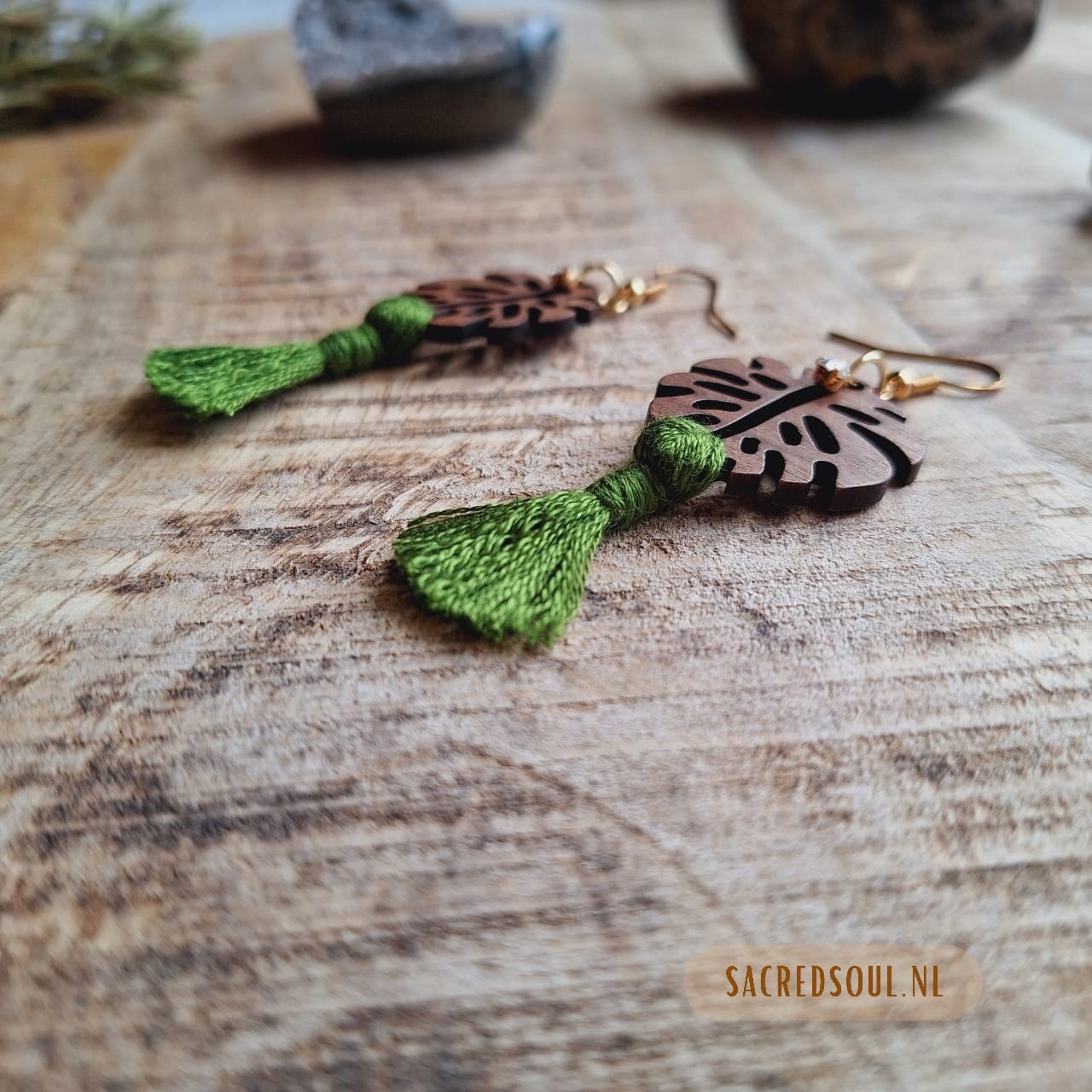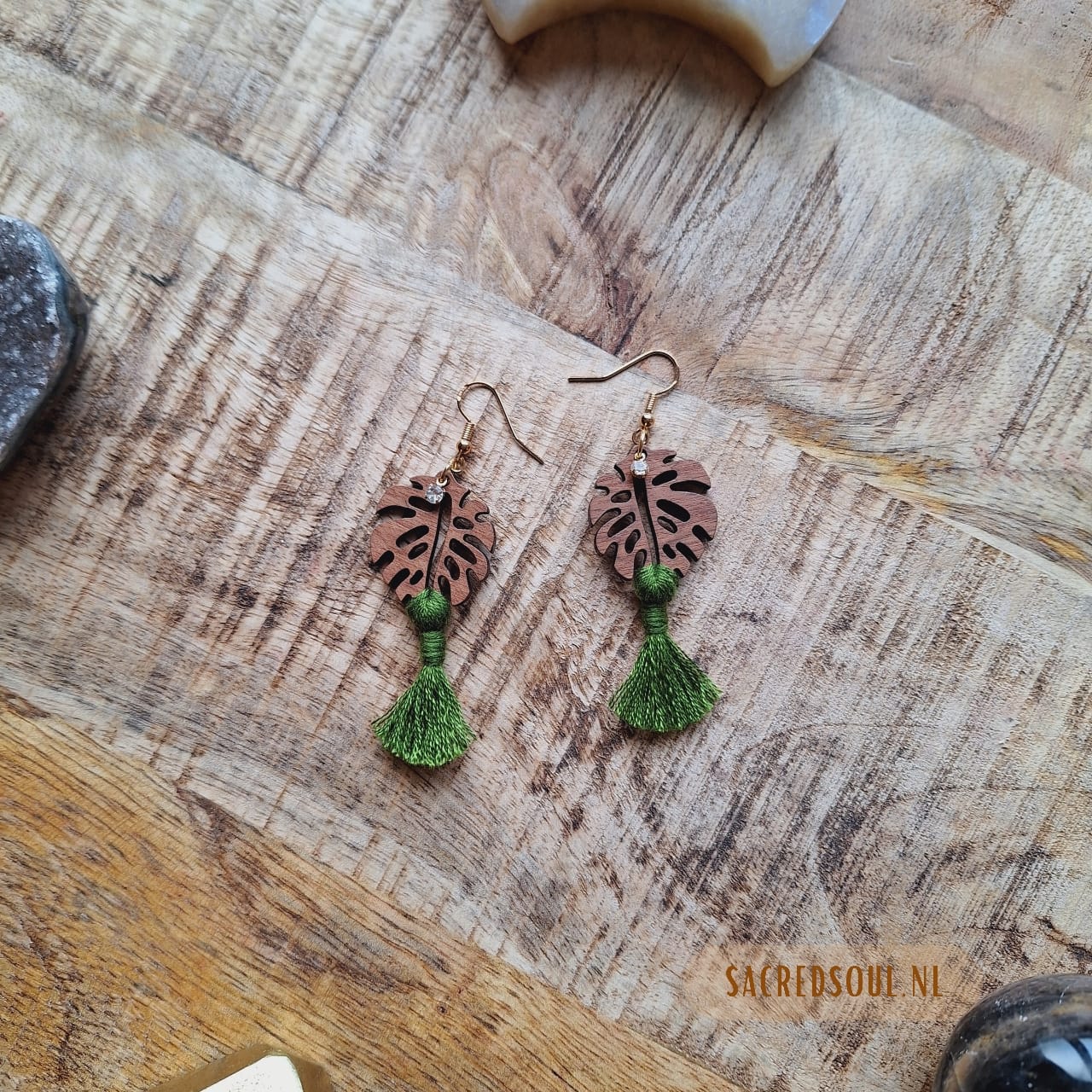 Elk paar ‘Fae’ oorbellen is vakkundig vervaardigd uit gelaserd hout, met een delicaat ontwerp dat lijkt op het weelderige blad van de Monstera Deliciosa. Dit natuurlijke element wordt versterkt door een smaragdgroen macramé kwastje, dat meedeint met elke beweging, als een eerbetoon aan de speelse energie van de natuur. Ze zijn afgewerkt met een glinsterend stras steentje.